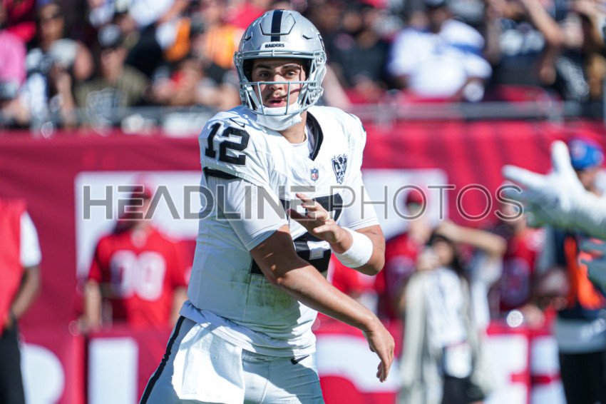 Tampa Bay, Florida, USA, December 8, 2024, Las Vegas Raiders quarterback Aidan O'Connel #12 makes a pass at Raymond James Stadium. (Photo Credit: Marty Jean-Louis)