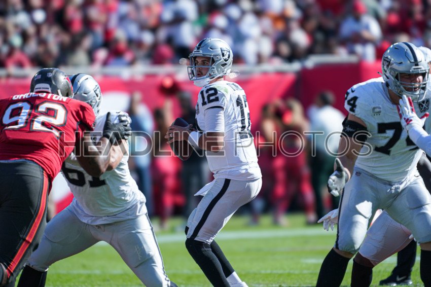 Tampa Bay, Florida, USA, December 8, 2024, Las Vegas Raiders quarterback Aidan O'Connel #12 readies to make a pass at Raymond James Stadium. (Photo Credit: Marty Jean-Louis)