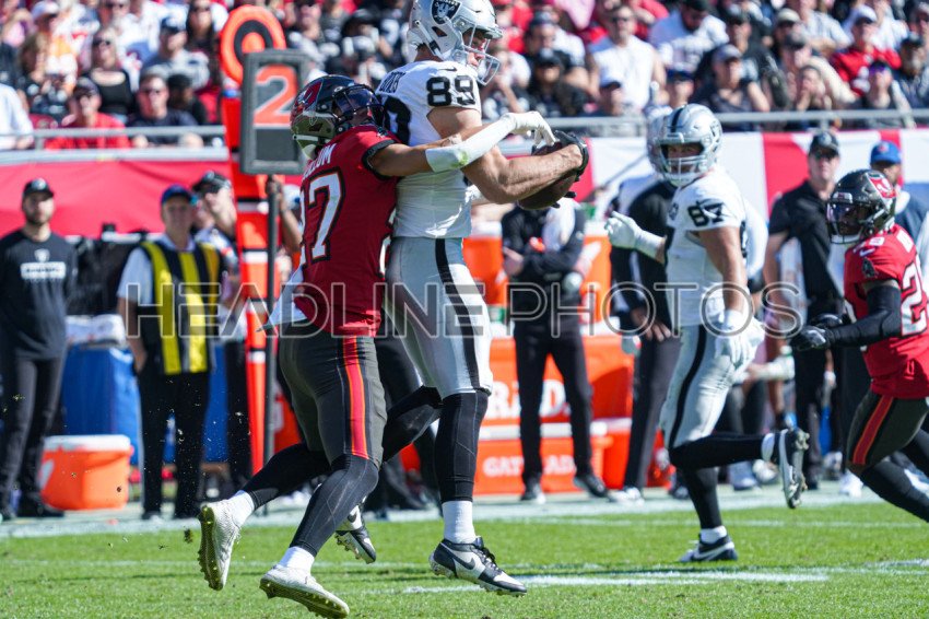Tampa Bay, Florida, USA, December 8, 2024, Las Vegas Raiders tight end Justin Shorter #89 makes a catch but is tackled by Zyon McCollum #27 at Raymond James Stadium. (Photo Credit: Marty Jean-Louis)