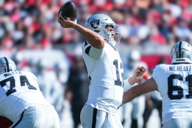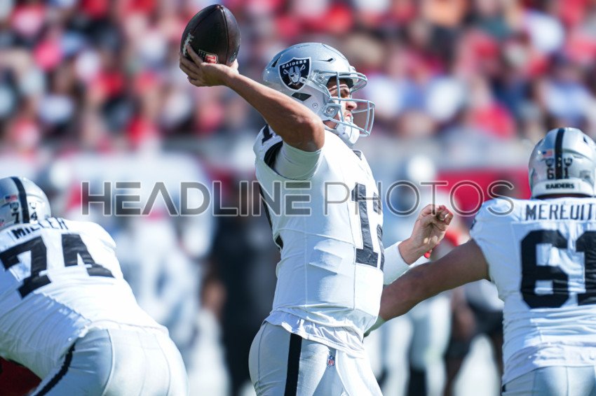 Tampa Bay, Florida, USA, December 8, 2024, Las Vegas Raiders quarterback Aidan O'Connel #12 makes a pass at Raymond James Stadium. (Photo Credit: Marty Jean-Louis)