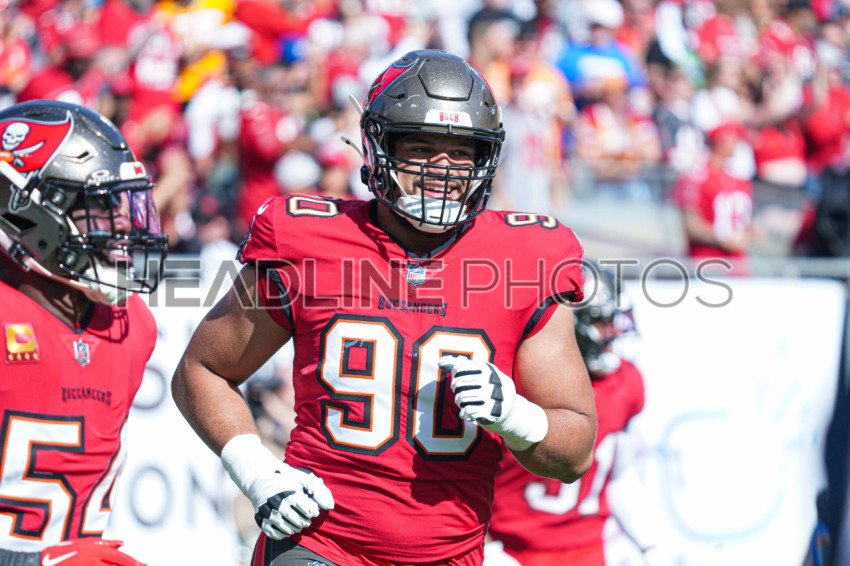 Tampa Bay, Florida, USA, December 8, 2024, Tampa Bay Buccaneers player Logan Hall #90 smiling after a play at Raymond James Stadium. (Photo Credit: Marty Jean-Louis)