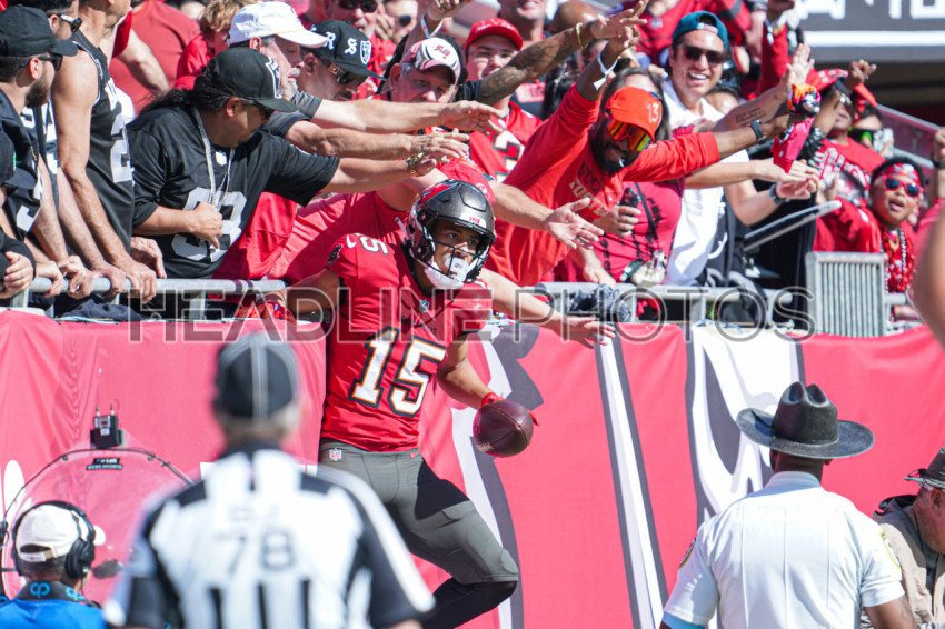 Tampa Bay, Florida, USA, December 8, 2024, Tampa Bay Buccaneers wide receiver Jalen McMillan #15 celebrate with fans after making a touchdown at Raymond James Stadium. (Photo Credit: Marty Jean-Louis)