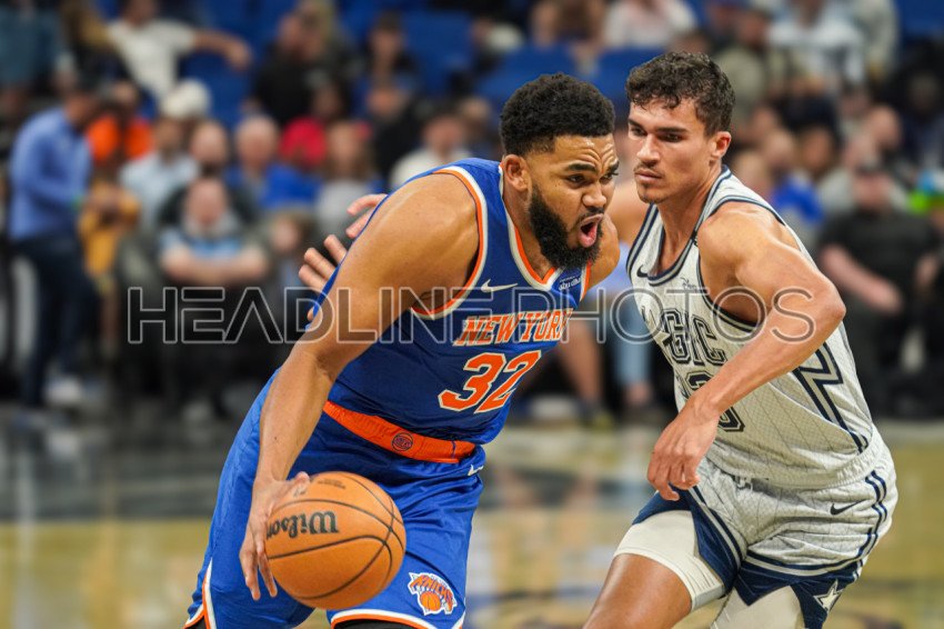 Orlando, Florida, USA, December 15, 2024, New York Knicks center Karl-Anthony Towns #32 runs pass Tristan da Silva #23 at the Kia Center. (Photo Credit: Marty Jean-Louis)