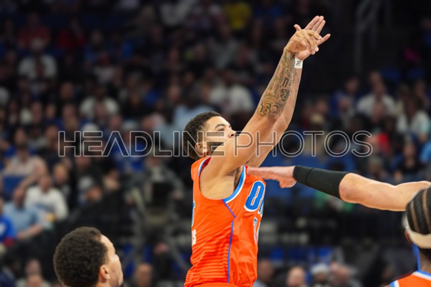 Orlando, Florida, USA, December 19, 2024, Oklahoma Thunder guard Kenrich Williams #34 shoots a three at the Kia Center. (Photo Credit: Marty Jean-Louis)