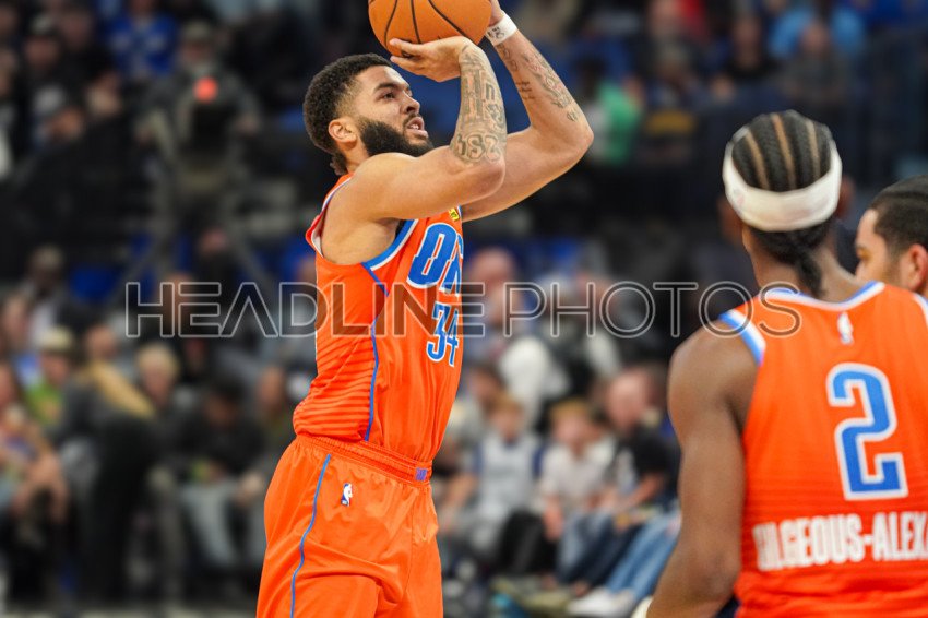 Orlando, Florida, USA, December 19, 2024, Oklahoma Thunder guard Kenrich Williams #34 shoots a three at the Kia Center. (Photo Credit: Marty Jean-Louis)