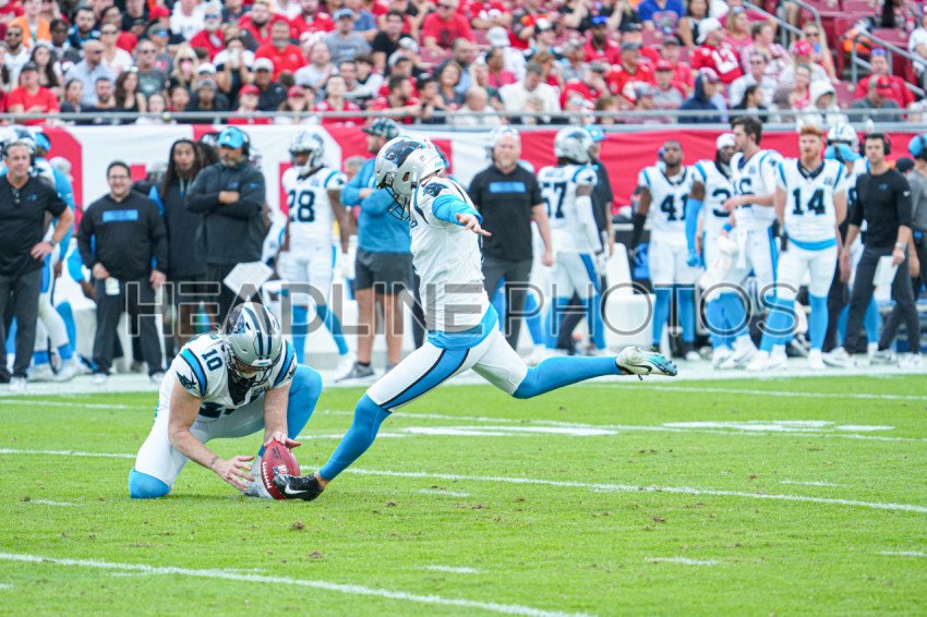 Tampa Bay, Florida, USA, December 29, 2024, Carolina Panthers kicker Eddy Pinero #4 makes a kick at Raymond James Stadium. (Photo Credit: Marty Jean-Louis)