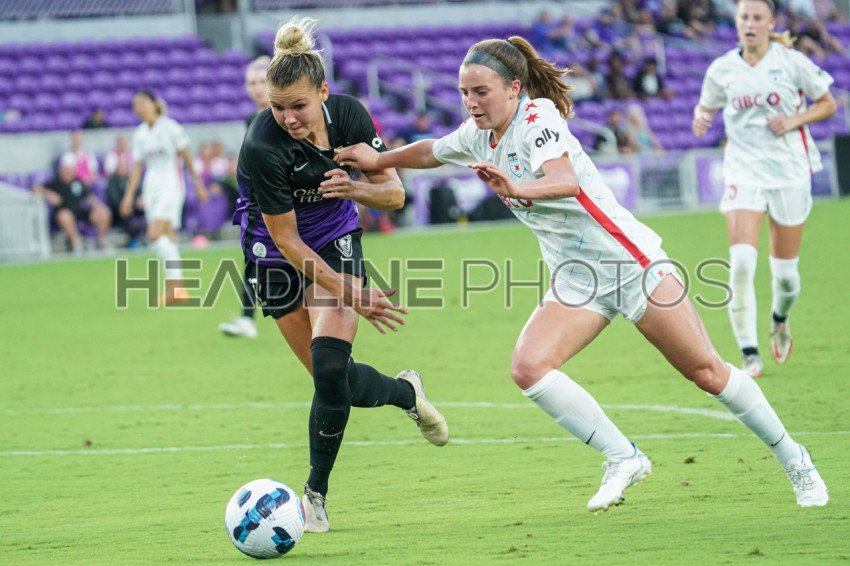 Orlando, Florida, USA, May 22, 2022, Chicago Red Stars player Griffith Sarah #15 and Orlando Pride player Lawrence Carrie #12 fight for the ball at Exploria Stadium. (Photo Credit: Marty Jean-Louis)