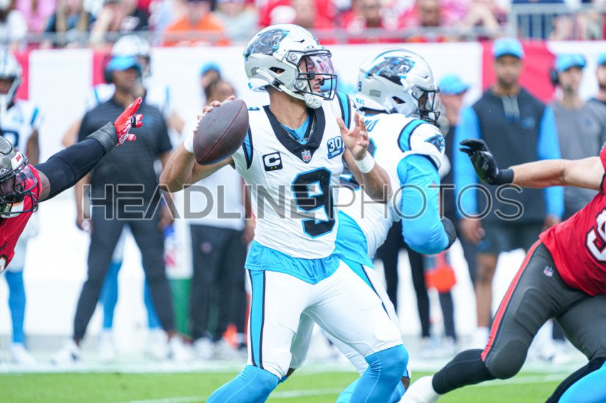 Tampa Bay, Florida, USA, December 29, 2024, Carolina Panthers quarterback Bryce Young #9 readies to make a pass at Raymond James Stadium. (Photo Credit: Marty Jean-Louis)