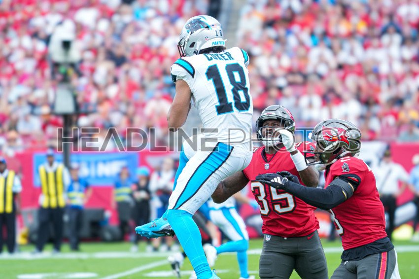 Tampa Bay, Florida, USA, December 29, 2024, Carolina Panthers wide receiver Jalen Coker #18 makes a catch at Raymond James Stadium. (Photo Credit: Marty Jean-Louis)