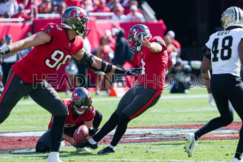 Tampa Bay, Florida, USA, January 5, 2025, Tampa Bay Buccaneers kicker Chase McLaughlin #4 makes a kick at Raymond James Stadium. (Photo Credit: Marty Jean-Louis)