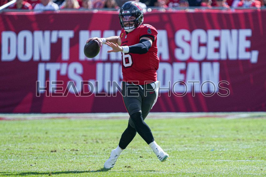 Tampa Bay, Florida, USA, January 5, 2025, Tampa Bay Buccaneers quarterback Baker Mayfield #6 makes a pass at Raymond James Stadium. (Photo Credit: Marty Jean-Louis)
