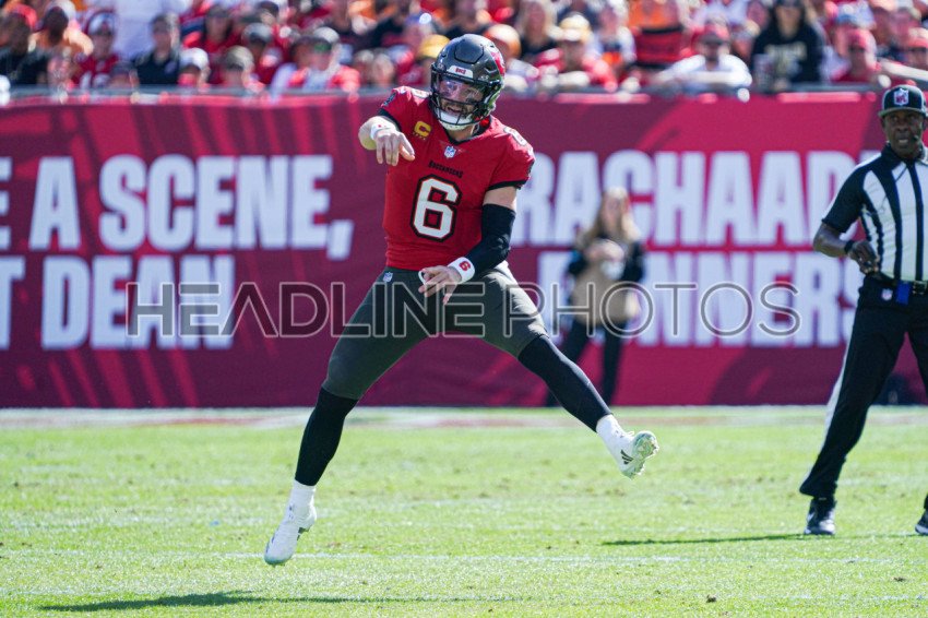 Tampa Bay, Florida, USA, January 5, 2025, Tampa Bay Buccaneers quarterback Baker Mayfield #6 makes a pass at Raymond James Stadium. (Photo Credit: Marty Jean-Louis)