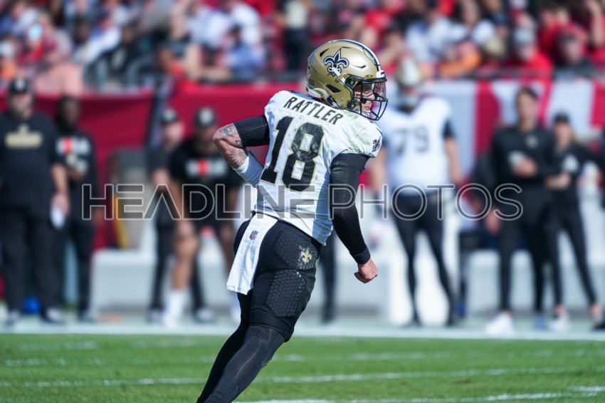 Tampa Bay, Florida, USA, January 5, 2025, New Orleans Saints quarterback Spencer Rattler #18 during the first quarter at Raymond James Stadium. (Photo Credit: Marty Jean-Louis)