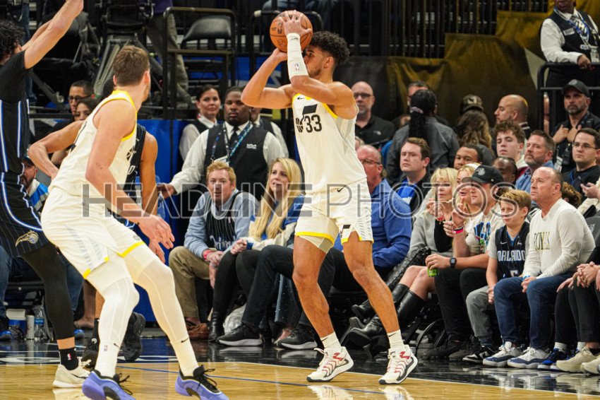 Orlando, Florida, USA, January 5, 2025, Utah Jazz forward Johnny Juzang #33 shoots a three in the first at the Kia Center. (Photo Credit: Marty Jean-Louis)