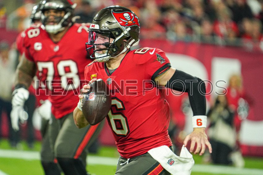Tampa Bay, Florida, USA, January 12, 2025, Tampa Bay Buccaneers quarterback Baker Mayfield #6 on the run at Raymond James Stadium. (Photo Credit: Marty Jean-Louis)