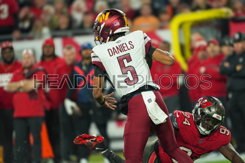 Tampa Bay, Florida, USA, January 12, 2025, Washington Commanders quarterback Jayden Daniels on the run at Raymond James Stadium. (Photo Credit: Marty Jean-Louis)