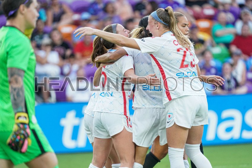 Orlando, Florida, USA, May 22, 2022, Chicago Red Stars players celebrate goal against the Orlando Pride at Exploria Stadium. (Photo Credit: Marty Jean-Louis)