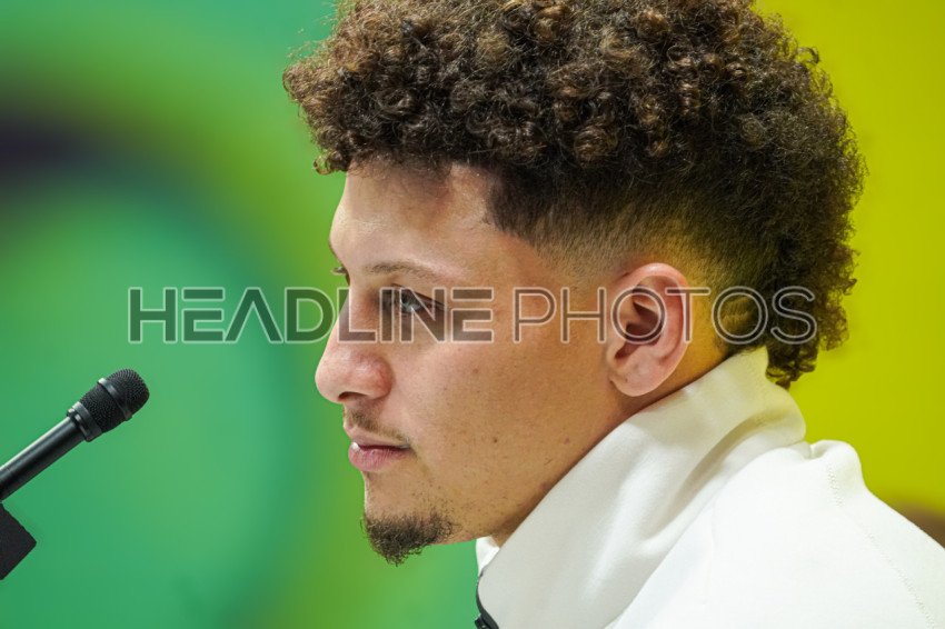Chiefs Quarterback Patrick Mahomes answering questions from reporters During the Super Bowl LIX (59) Opening Night Ceremony at the Caesars Superdome in New Orleans, Louisiana
