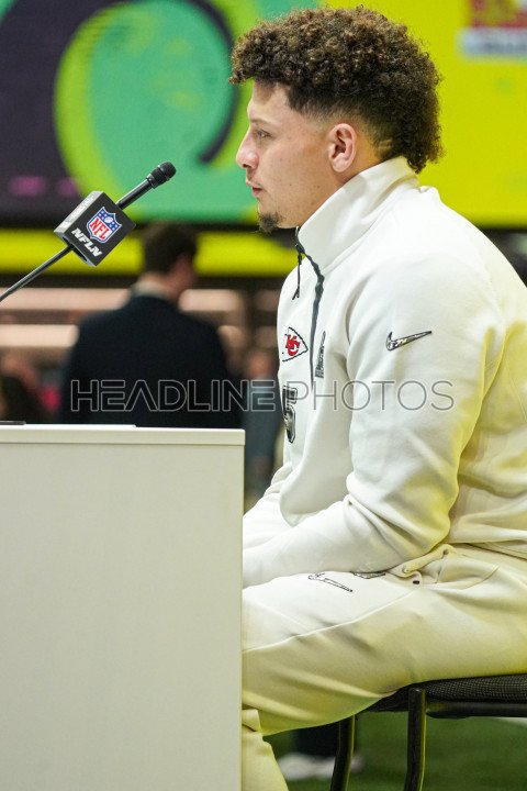 Chiefs Quarterback Patrick Mahomes answering questions from reporters During the Super Bowl LIX (59) Opening Night Ceremony at the Caesars Superdome in New Orleans, Louisiana