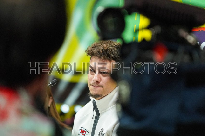 Chiefs Quarterback Patrick Mahomes answering questions from reporters During the Super Bowl LIX (59) Opening Night Ceremony at the Caesars Superdome in New Orleans, Louisiana