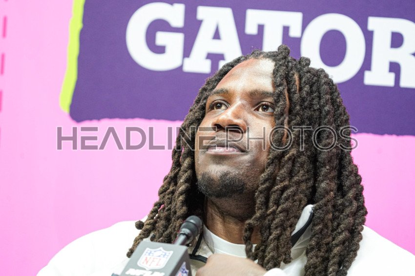 Chiefs player Nick Bolton answering questions from reporters During the Super Bowl LIX (59) Opening Night Ceremony at the Caesars Superdome in New Orleans, Louisiana