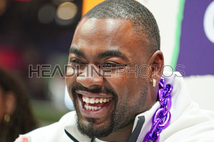 Chiefs player Chris Jones answering questions from reporters During the Super Bowl LIX (59) Opening Night Ceremony at the Caesars Superdome in New Orleans, Louisiana