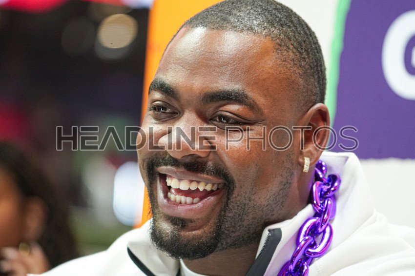 Chiefs player Chris Jones answering questions from reporters During the Super Bowl LIX (59) Opening Night Ceremony at the Caesars Superdome in New Orleans, Louisiana