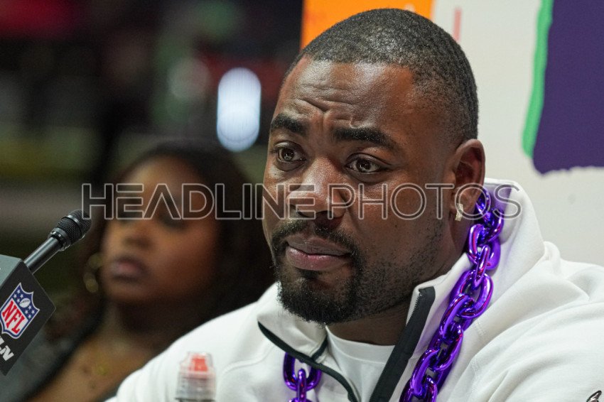 Chiefs player Chris Jones answering questions from reporters During the Super Bowl LIX (59) Opening Night Ceremony at the Caesars Superdome in New Orleans, Louisiana