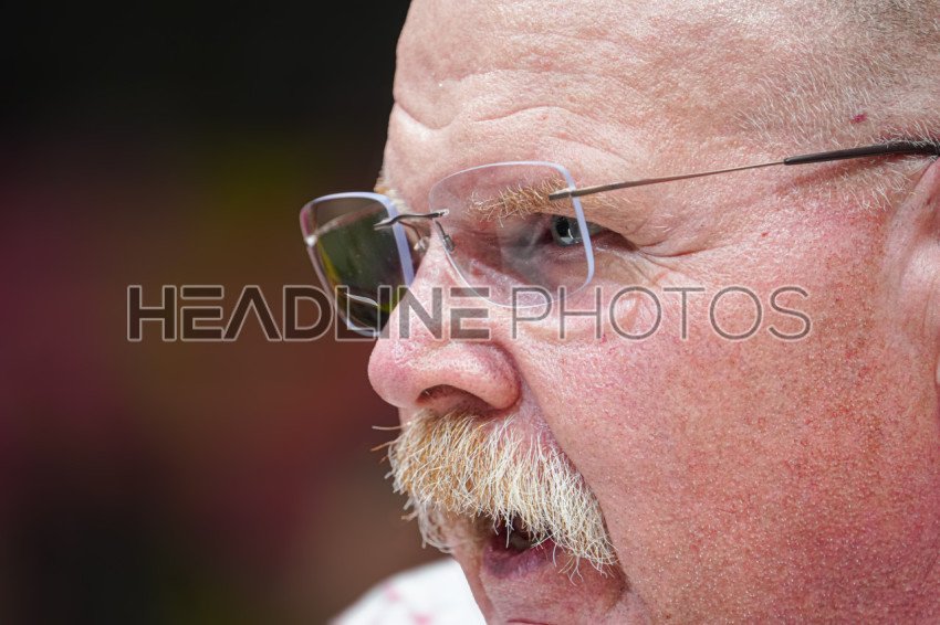 Chiefs head coach Andy Reid answering questions from reporters During the Super Bowl LIX (59) Opening Night Ceremony at the Caesars Superdome in New Orleans, Louisiana