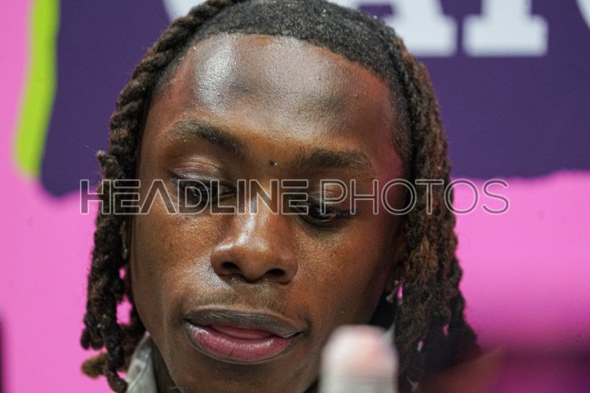 Chiefs player Xavier Worthy answering questions from reporters During the Super Bowl LIX (59) Opening Night Ceremony at the Caesars Superdome in New Orleans, Louisiana