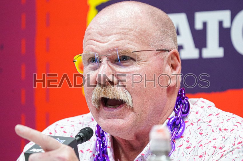 Chiefs head coach Andy Reid answering questions from reporters During the Super Bowl LIX (59) Opening Night Ceremony at the Caesars Superdome in New Orleans, Louisiana