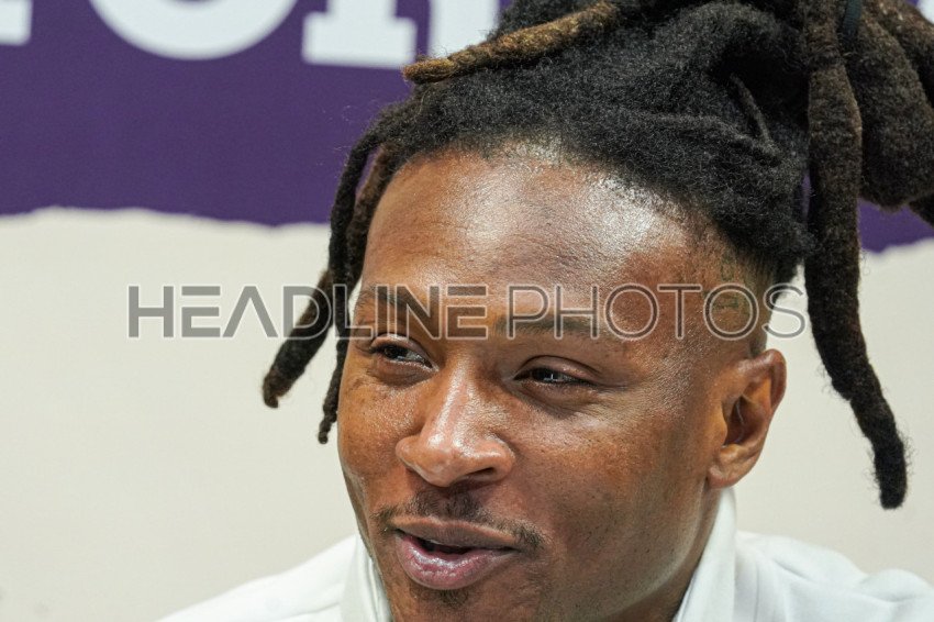 Chiefs player DeAndre Hopkins answering questions from reporters During the Super Bowl LIX (59) Opening Night Ceremony at the Caesars Superdome in New Orleans, Louisiana