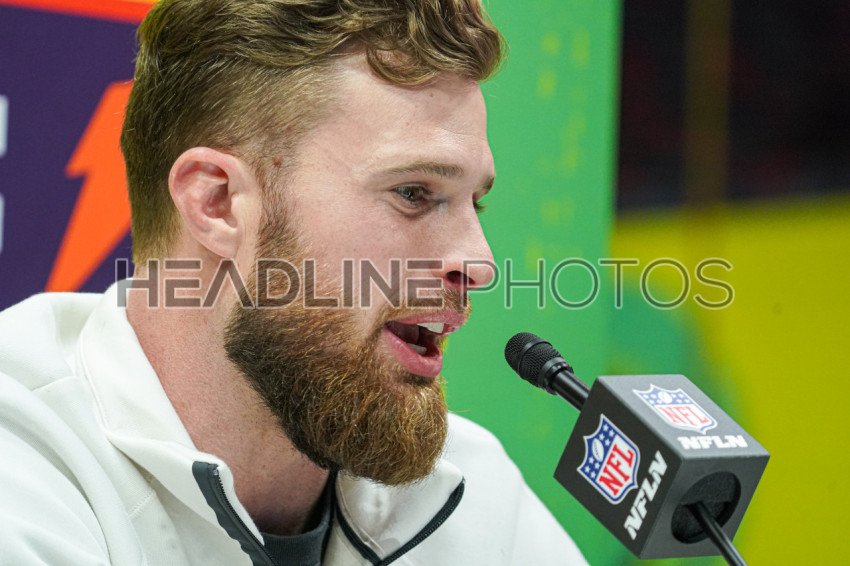 Chiefs player Harrison Butker answering questions from reporters During the Super Bowl LIX (59) Opening Night Ceremony at the Caesars Superdome in New Orleans, Louisiana