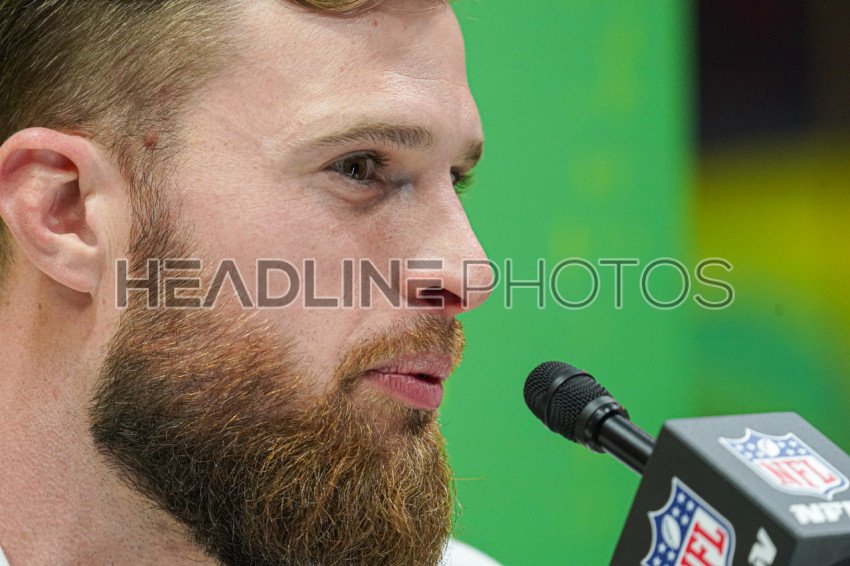 Chiefs player Harrison Butker answering questions from reporters During the Super Bowl LIX (59) Opening Night Ceremony at the Caesars Superdome in New Orleans, Louisiana