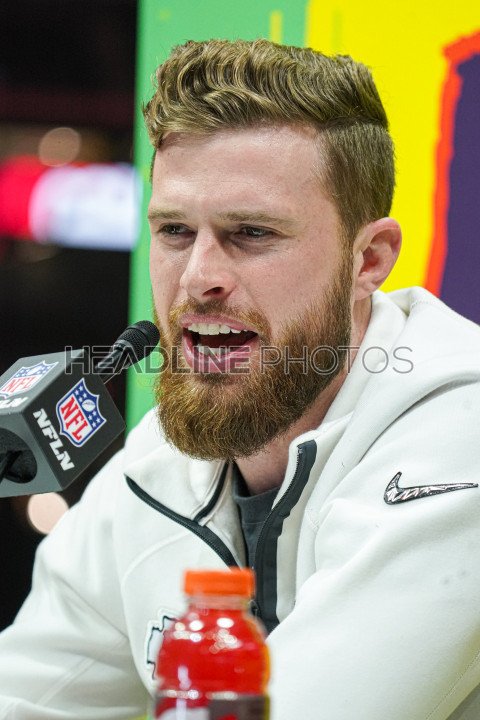 Chiefs player Harrison Butker answering questions from reporters During the Super Bowl LIX (59) Opening Night Ceremony at the Caesars Superdome in New Orleans, Louisiana