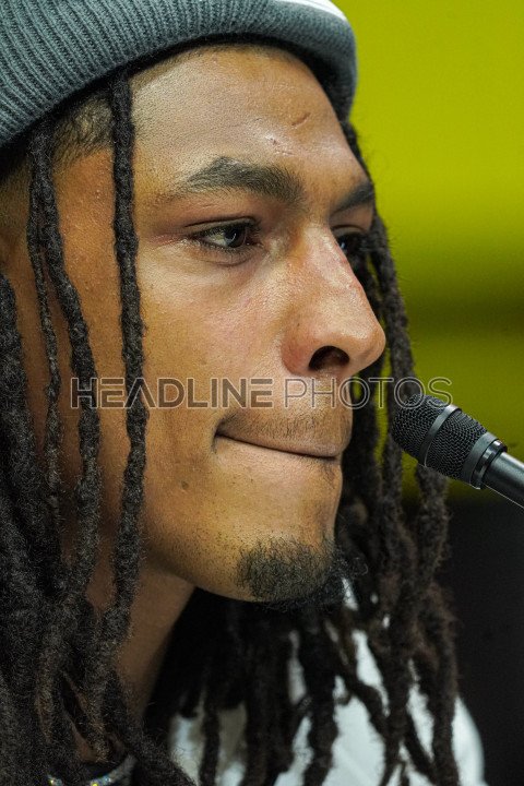 Chiefs player Isiah Pacheco answering questions from reporters During the Super Bowl LIX (59) Opening Night Ceremony at the Caesars Superdome in New Orleans, Louisiana
