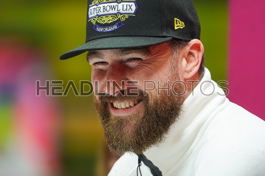 Chiefs player Jason Kelce answering questions from reporters During the Super Bowl LIX (59) Opening Night Ceremony at the Caesars Superdome in New Orleans, Louisiana
