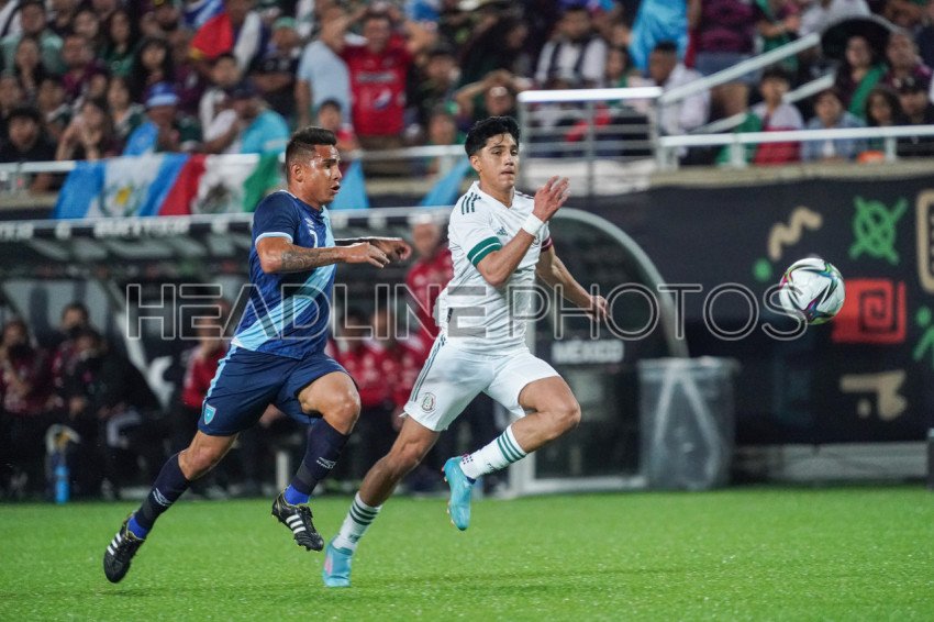 Orlando, Florida, USA, April 27, 2022, Guatemala playerAndrés Lezcano #7 and Mexico player Kevin Álvarez #2 fight for the ball in the first half at Camping World Stadium. (Photo Credit: Marty Jean-Louis)