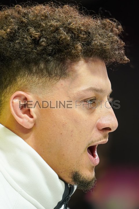 Chiefs Quarterback Patrick Mahomes answering questions from reporters During the Super Bowl LIX (59) Opening Night Ceremony at the Caesars Superdome in New Orleans, Louisiana