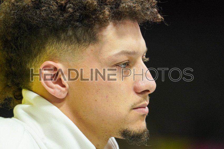 Chiefs Quarterback Patrick Mahomes answering questions from reporters During the Super Bowl LIX (59) Opening Night Ceremony at the Caesars Superdome in New Orleans, Louisiana