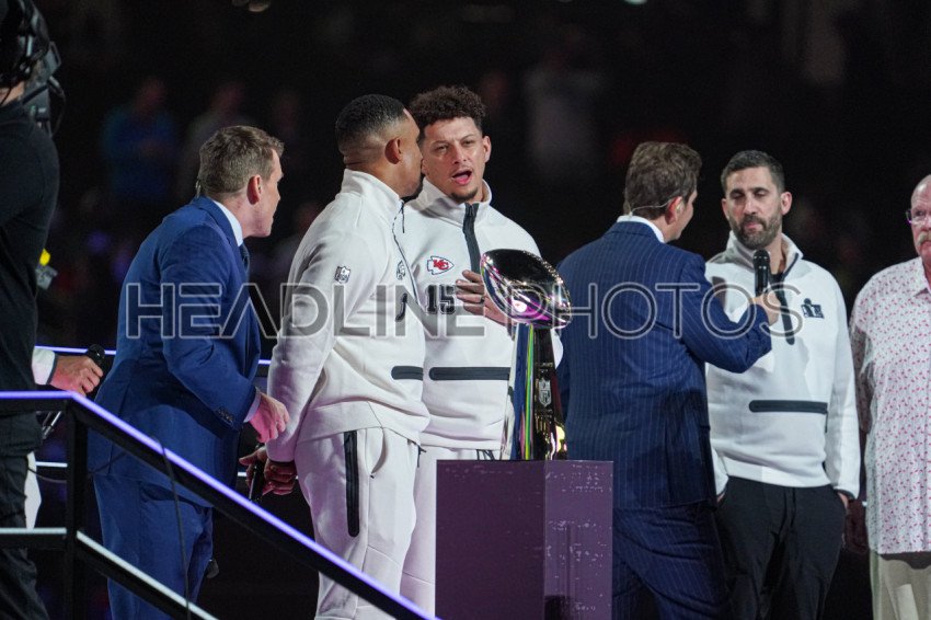 Quarterbacks Jalen Hurts (right) and Patrick Mahomes During the Super Bowl LIX (59) Opening Night Ceremony at the Caesars Superdome in New Orleans, Louisiana