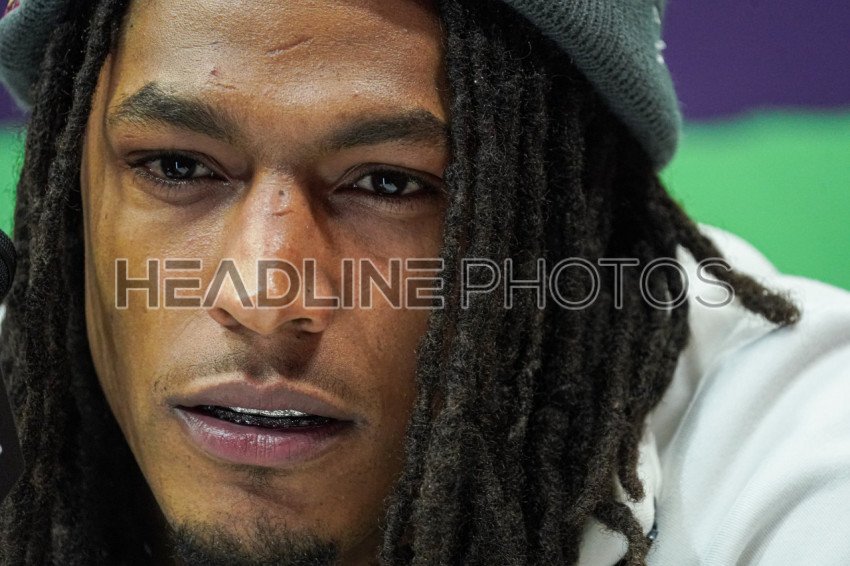 Chiefs player Isiah Pacheco answering questions from reporters During the Super Bowl LIX (59) Opening Night Ceremony at the Caesars Superdome in New Orleans, Louisiana