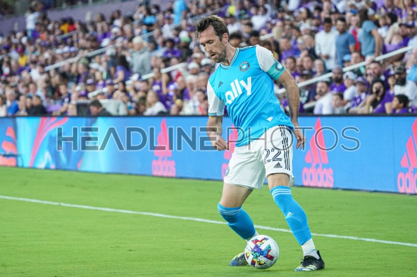Orlando, Florida, USA, April 30, 2022, Charlotte FC Captain Christian Fuchs #22 receives a pass in the first half at Exploria Stadium. (Photo Credit: Marty Jean-Louis)