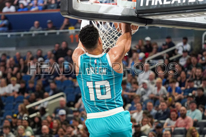 Orlando, Florida, USA, February 12, 2025, Charlotte Hornets forward Josh Green #10 makes a dunk at the Kia Center. (Photo Credit: Marty Jean-Louis)