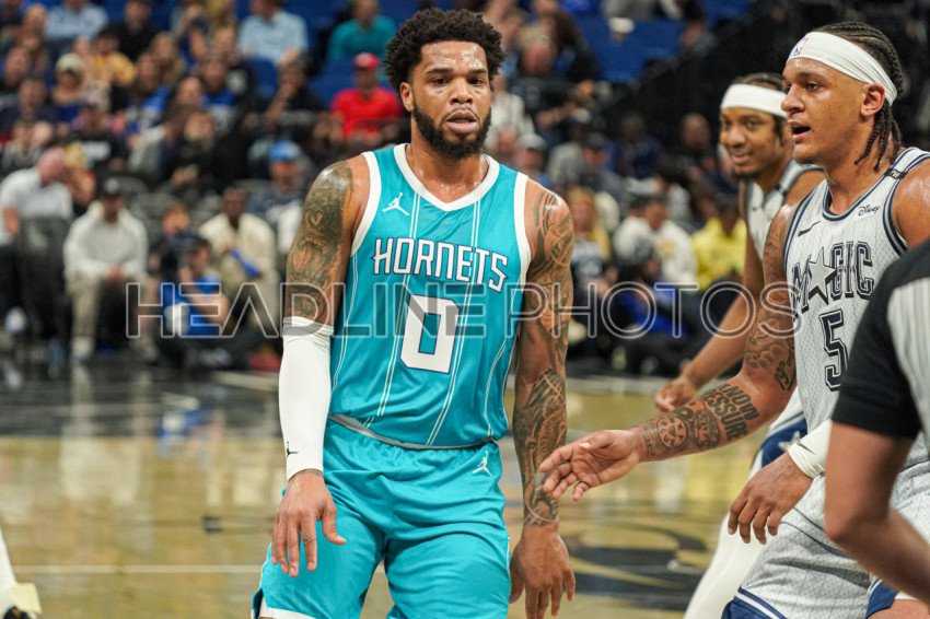 Orlando, Florida, USA, February 12, 2025, Charlotte Hornets forward Miles Bridges #0 rushes forward at the Kia Center. (Photo Credit: Marty Jean-Louis)