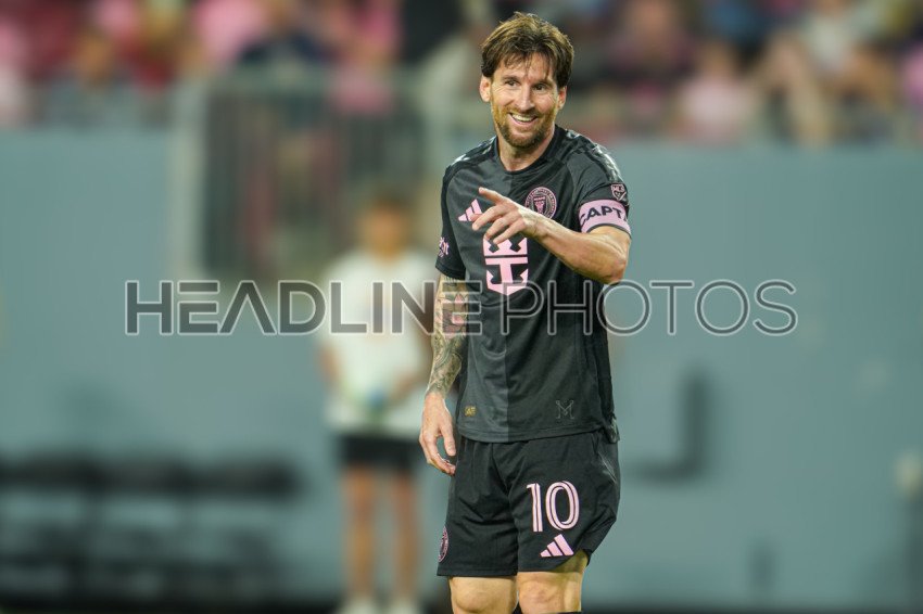 Tampa, Florida, USA, February 14, 2025, Inter Miami players Lionel Messi #10 smiling after a play in a friendly Florida Derby Match at Raymond James Stadium. (Photo Credit: Marty Jean-Louis)