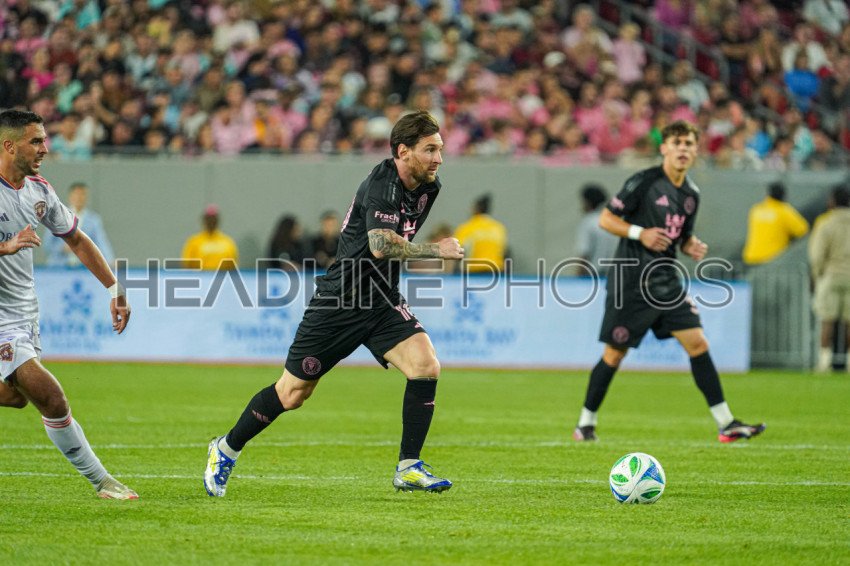 Tampa, Florida, USA, February 14, 2025, Inter Miami players Lionel Messi #10 rushes up field in a friendly Florida Derby Match at Raymond James Stadium. (Photo Credit: Marty Jean-Louis)