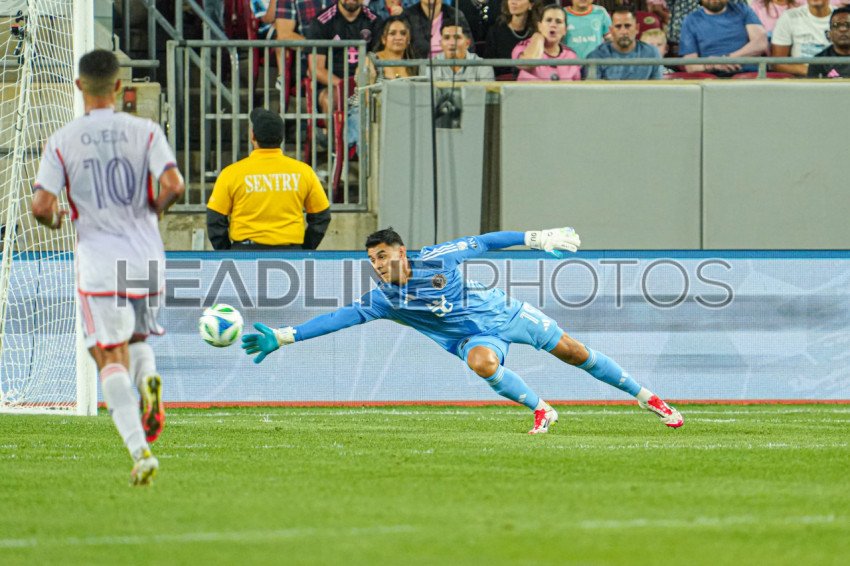 Tampa, Florida, USA, February 14, 2025, Inter Miami goalkeeper Oscar Ustari #19 jumps after the ball in a friendly Florida Derby Match at Raymond James Stadium. (Photo Credit: Marty Jean-Louis)