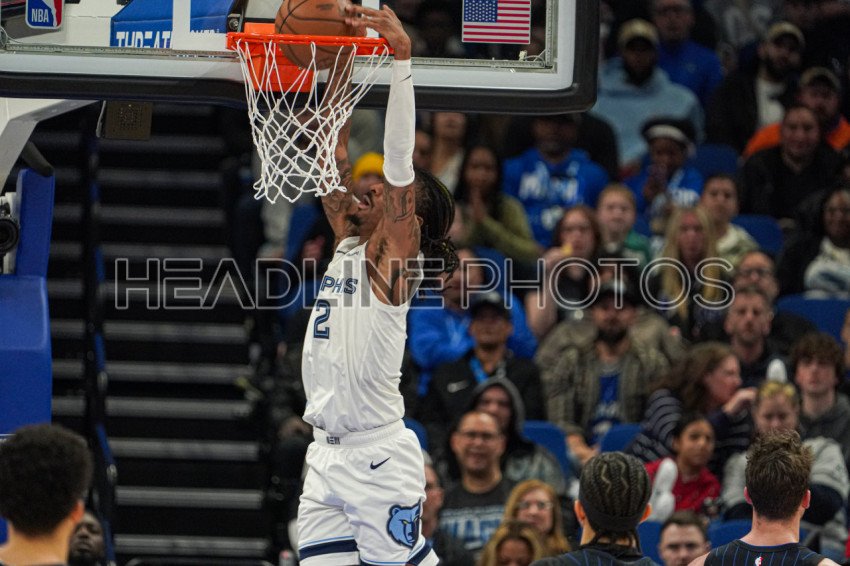 Orlando, Florida, USA, February 21, 2025, Memphis Grizzlies guard Ja Morant #12 makes a dunk at the Kia Center. (Photo Credit: Marty Jean-Louis)