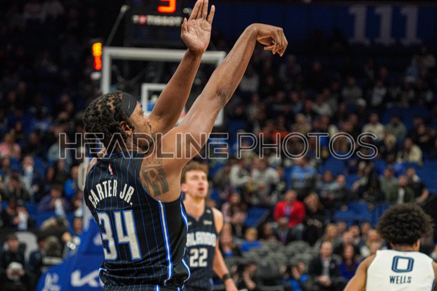 Orlando, Florida, USA, February 21, 2025, Orlando Magic forward Wendell Carter Jr #34 shoots a three at the Kia Center. (Photo Credit: Marty Jean-Louis)